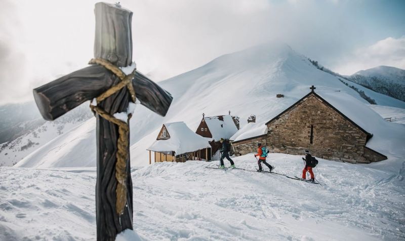 Chacun de nous, l'un après l'autre, reçoit une chaîne en fer de trente kilos et doit marcher autour de l'autel en pensant à ses péchés. Une fois que nous nous sommes souvenus de tous nos péchés, nous avons été autorisés à retirer le lourd poids de la chaîne de fer et à ressentir un véritable «soulagement». Sans péché et avec un esprit léger, nous pouvons maintenant prendre le chemin du retour. Le moment ne pouvait pas être plus opportun: à cet instant précis, le soleil se montre et ouvre la vue jusqu'à la Russie. Avec un sentiment de liberté et une autre expérience inoubliable dans nos sacs à dos, nous partons et profitons d'une longue descente dans la lumière dorée du soleil du soir. Hormis les paysages époustouflants des chaînes de montagnes allongées qui s'étendent jusqu'à la Russie, la Géorgie nous séduit également par sa culture merveilleuse et ses habitants chaleureux. Où que nous soyons, nous, les deux jeunes femmes, avons été accueillies très chaleureusement et avec une hospitalité débordante, et gâtées par une nourriture délicieuse. Peu connu et tout à fait excellent: le vin rouge géorgien! Avec ses huit mille ans d'expérience dans la production de vin, la petite république du Caucase est considérée comme l'un des berceaux de la culture du vin. Ainsi, après des journées de ski épuisantes, nous avons pu nous ressourcer pour le lendemain en buvant un bon verre de vin. Outre les possibilités de ski quasi illimitées, la Géorgie possède également une capitale qui vaut le détour.